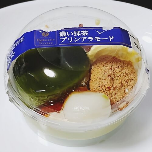 ドンレミーのパティスリーテラスブランド、抹茶プリンアラモードなのー。1個252kcalなの。 原材料は乳等を主要原料とする食品、牛乳、液卵、砂糖、つぶあん、もち米粉、小麦粉、メープル風味フィリング、抹茶寒天、ゼラチン、澱粉、きな粉、黒糖液、製菓材料…