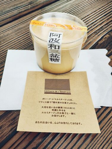 ガトー・ド・レ エルミタージュのプリン、2つめは和三盆を使ったプリンなのー。 食感は普通のプリンよりも少しだけつるんと感が弱くなって、クリーム状になっていたのー。 プリンで感じた甘味の部分がそのまま和三盆の味に変わっていて、卵とミルクと和三盆…