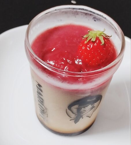 2つめはブリュレの上に国産いちごのプレザーブを載せたプリンなのー。 これもカロリーや原材料は不明なの。 プリンっていうよりもバターに近い、硬めだけれど口の中では溶けていくような食感になっていたのー。 風味もバターに近い感じで、甘さはかなり弱く…