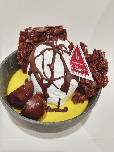 2つめはかぼちゃのプリンなの~。 大きなサクサクのチョコクランチと、2つにカットした栗が目を惹くの~。 中央の生クリームにはパリパリのチョココーティングが施されていたの~。 かぼちゃの風味は思ったほど強くなくて、周囲のチョコや生クリームの味の方…